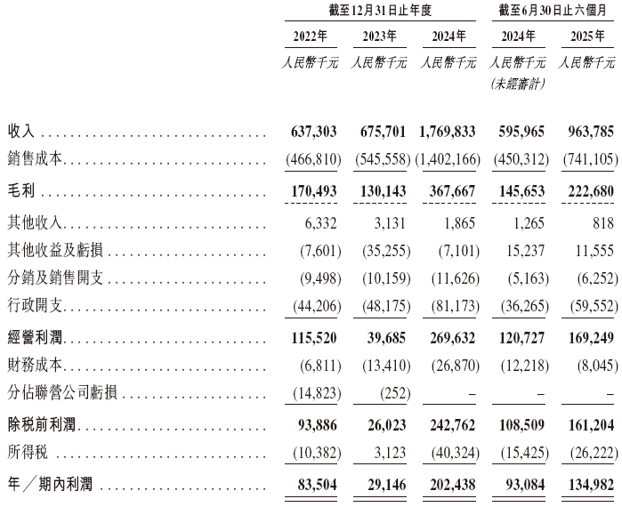 招股书显示,在过去的2022年、2023年、2024年和2025年前六个月,金浔股份的营业收入分别为人民币6.37亿、6.76亿、17.70亿和9.64亿元,相应的净利润分别为人民币0.84亿、0.29亿、2.02亿和1.35亿元。
