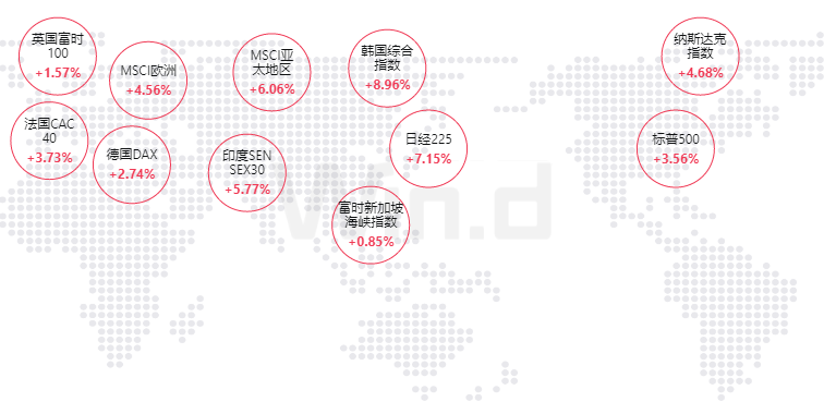 亚洲市场方面,韩国综合指数累计上涨8.96%;富时新加坡海峡指数、日经225指数、印度SENSEX30指数分别累计上涨0.85%、7.15%、5.77%。