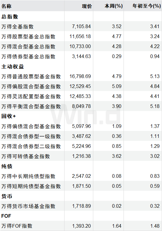 最近一周(2026年4月6日至4月10日),万得基金指数基本呈上涨态势。具体来看,万得全基指数累计涨幅为3.52%,万得偏股混合型基金指数涨幅最佳,累计涨幅为5.09%;万得股票型基金总指数、万得混合型基金总指数、万得普通股票型基金指数、万得灵活配置型基金指数累计涨幅均超4%。