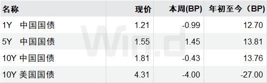 最近一周(2026年4月6日至4月10日),国债市场表现不一。1年期、10年期中国国债收益率分别下跌0.99个BP、0.43个BP,5年期中国国债收益率累计上涨1.45个BP;10年期美国国债收益本周累计下跌4个BP。