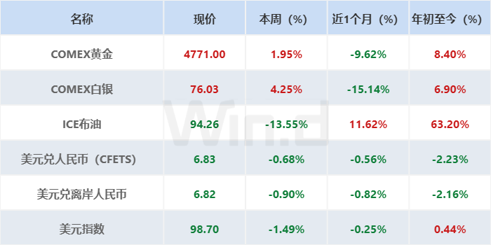 外汇方面,美元指数走弱,累计跌幅为1.49%;在岸、离岸人民币表现强势,累计涨幅分别为0.68%、0.90%。
